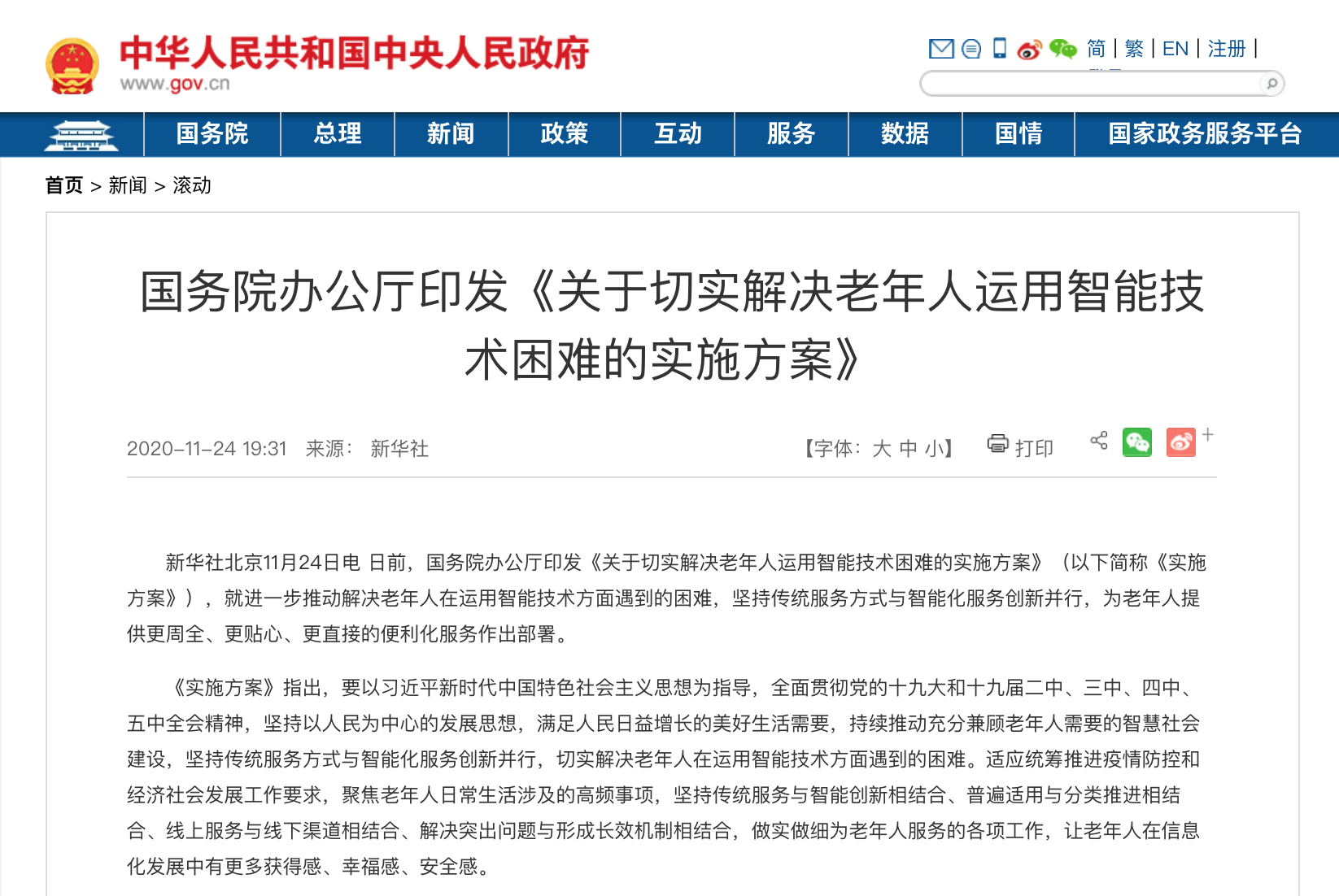 2021年3月4日,第十三届全国人民代表大会第四次会议在人民大会堂举行开幕会。国务院总理李克强作政府工作报告时,回顾了“十三五”时期发展成就和2020年工作,介绍了“十四五”时期主要目标任务和2021年重点工作。李克强在政府工作报告中指出,推进智能化服务要适应老年人需求,并做到不让智能工具给老年人日常生活造成障碍。