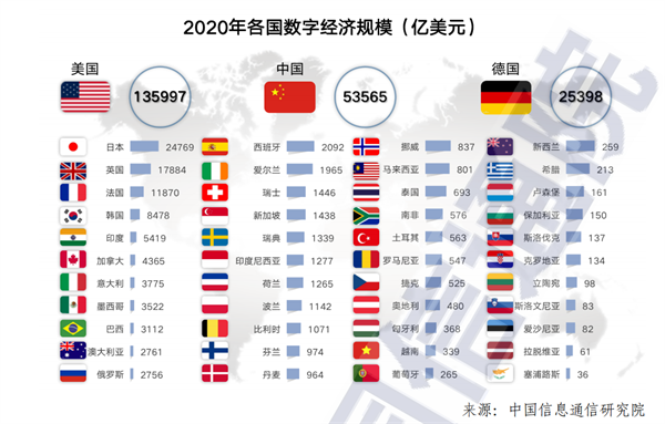 从规模看,美国数字经济继续蝉联世界第一,2020年规模接近13.6万亿美元,中国位居世界第二,规模逼近5.4万亿美元。德国、日本、英国位居第三至五位,规模分别约为2.54、2.48和1.79万亿美元。