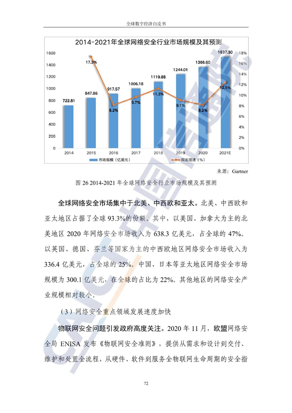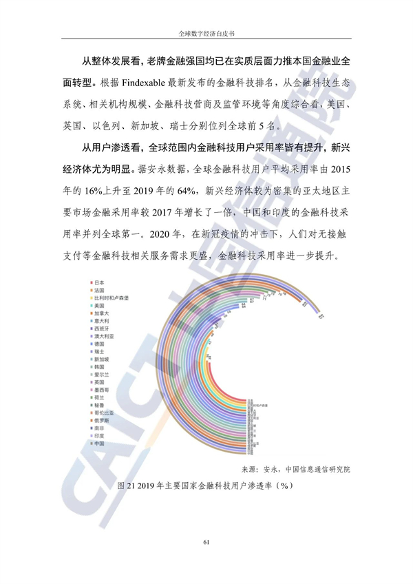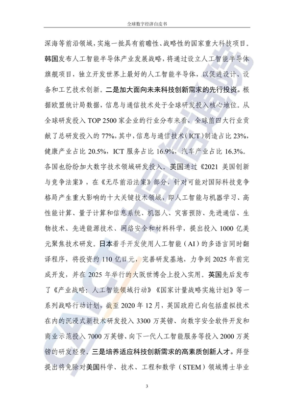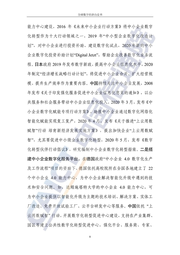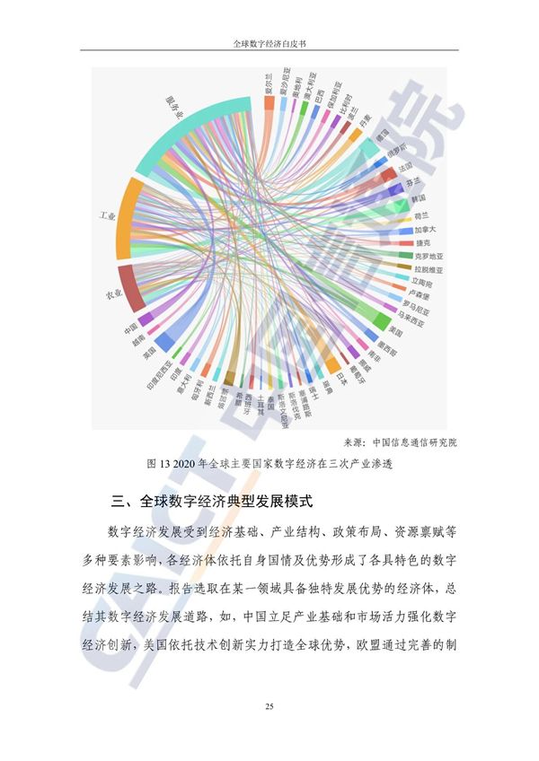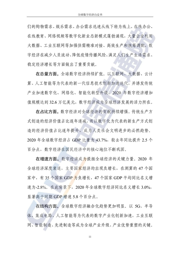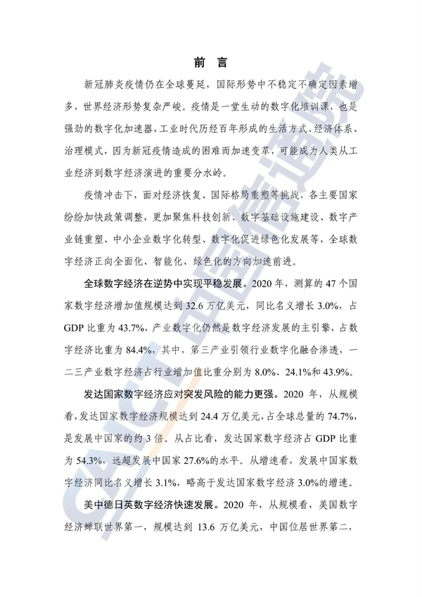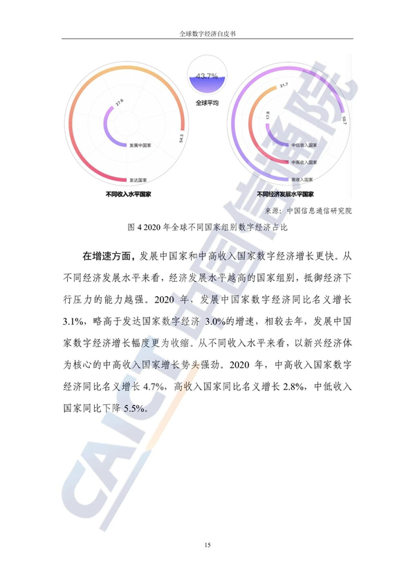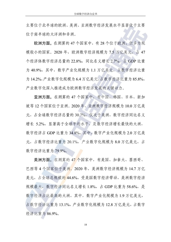 从不同经济发展水平看,20个发达国家的数字经济规模为24.4万亿美元增长3%,占GDP比重54.3%,明显优于27个发展中国家。