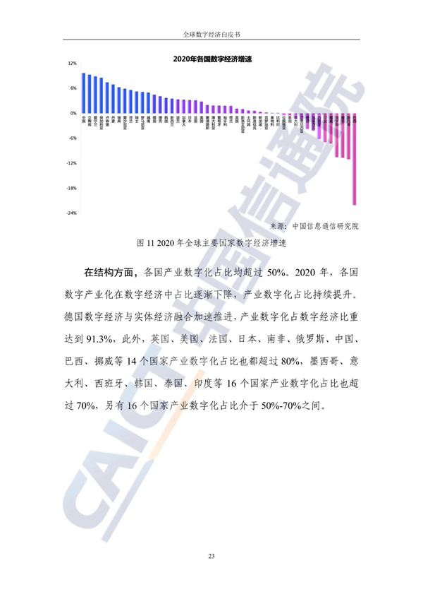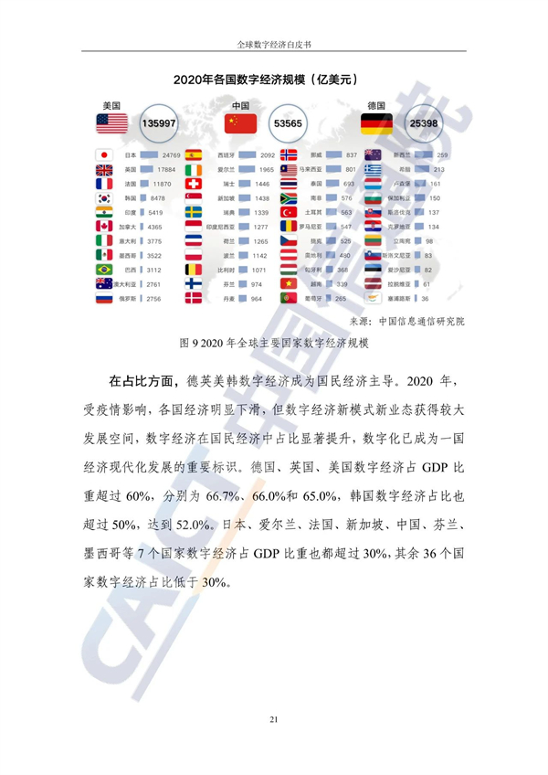 从占比看,德国、英国、美国数字经济在国民经济中占据主导地位,占GDP比重超过60%。