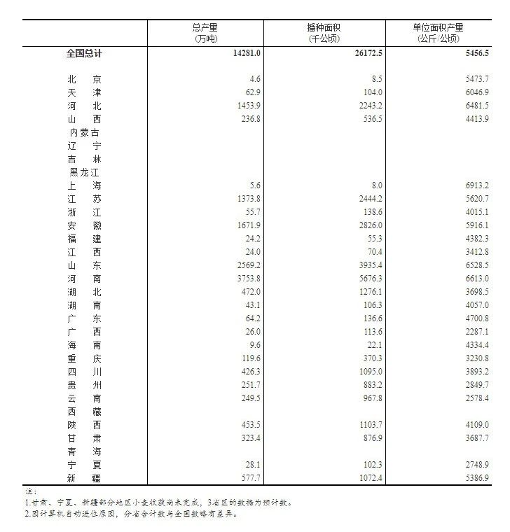 根据对全国25个夏粮生产省(区、市)的调查,2020年全国夏粮播种面积、单位面积产量、总产量如下:一、全国夏粮播种面积26172千公顷(39259 ...