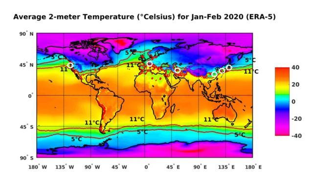 论文指出,新的疫情中心地区大致都在北纬30至50度范围内。